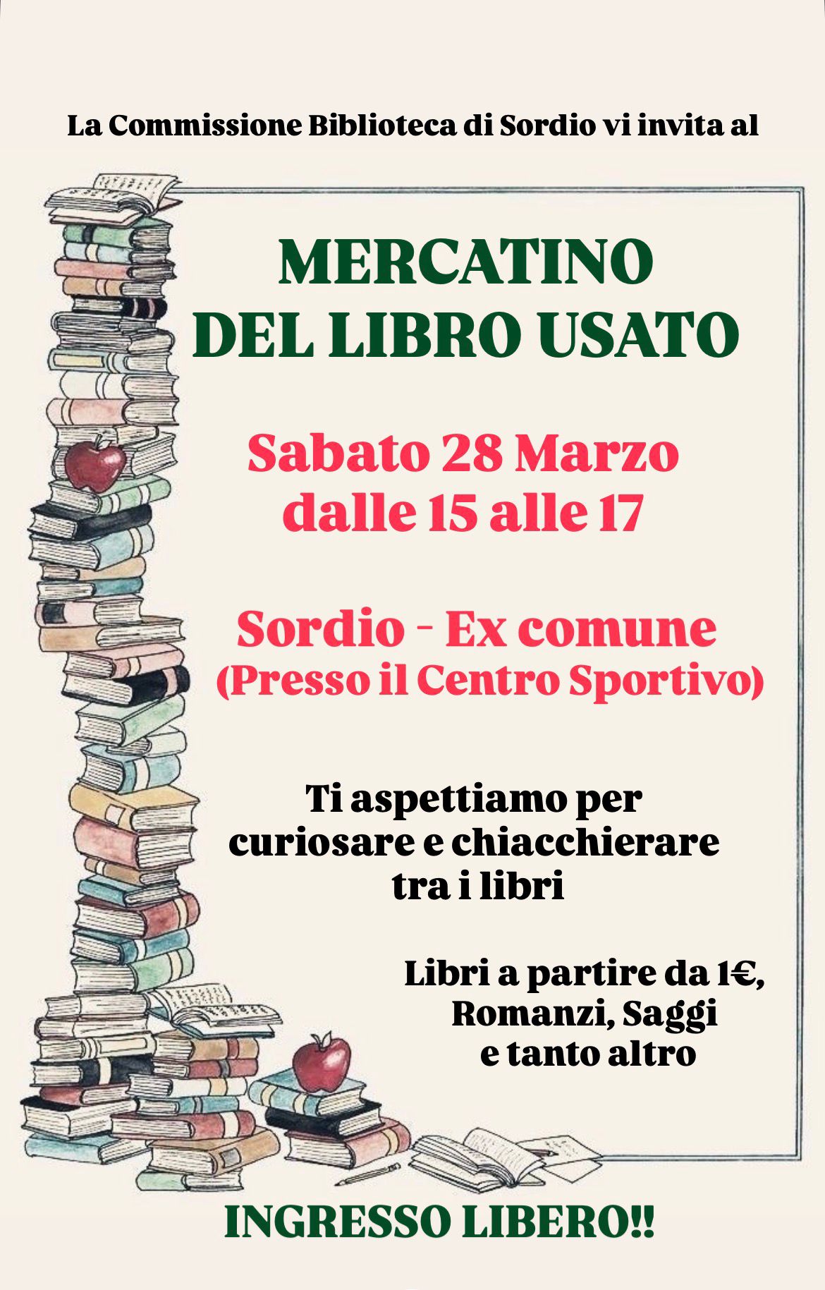 La Commissione Biblioteca Comunale organizza Sabato 28 marzo 2026, dalle ore 15.00 alle ore 17.00, il Mercatino del libro usato, presso il Centro Sportivo Comunale.