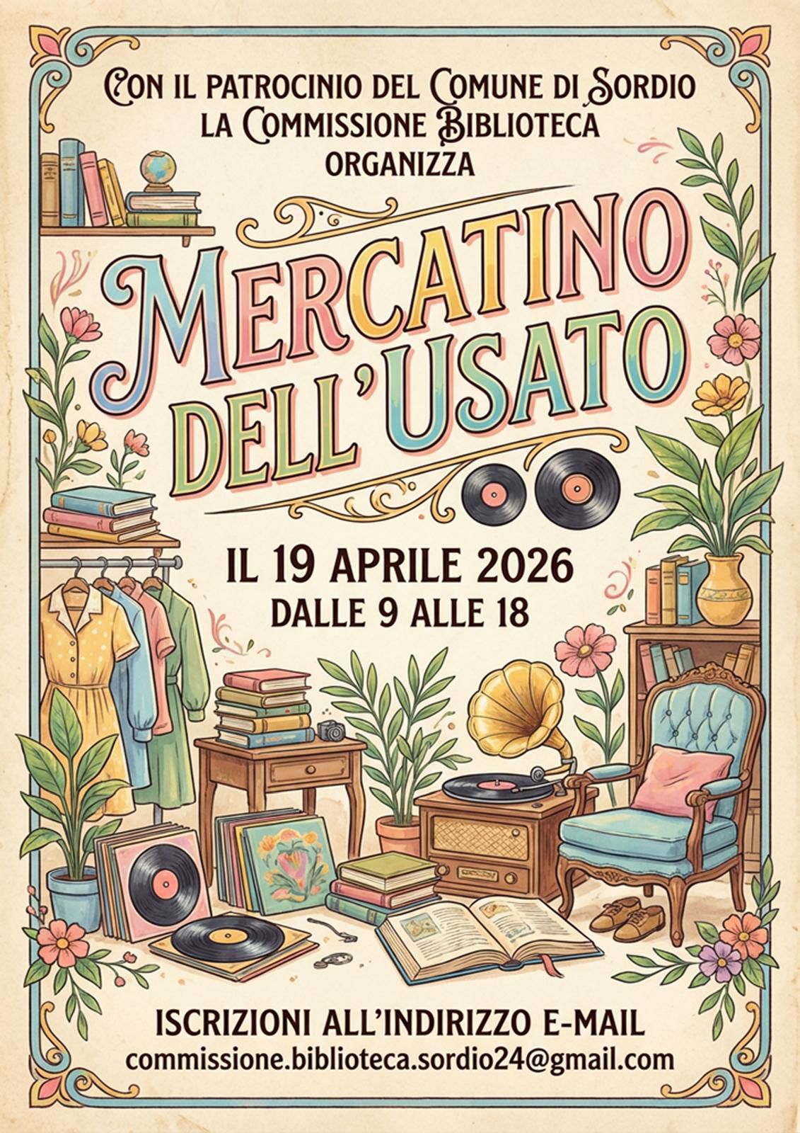 La Commissione Biblioteca, con il patrocinio del Comune di Sordio, organizza il MERCATINO DELL'USATO: Domenica 19 aprile 2026, dalle ore 9 alle ore 18.
